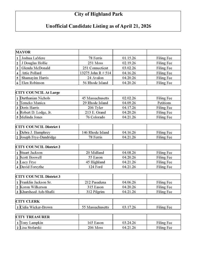 UNOFFICIAL Municipal Candidate Listing as of Tuesday, April 21, 2026