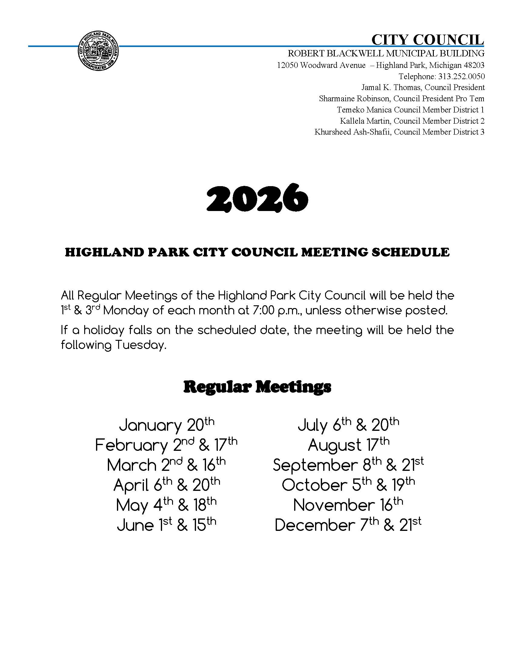 To receive agendas, by email, of upcoming Council meetings, submit your request to clerksoffice@highlandparkmi.gov.